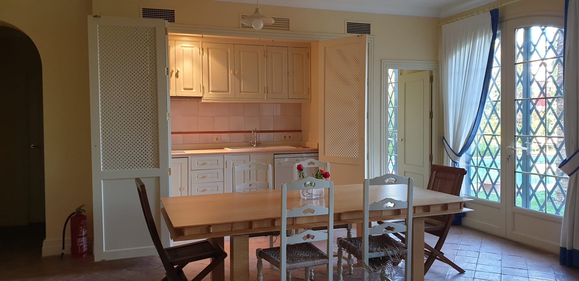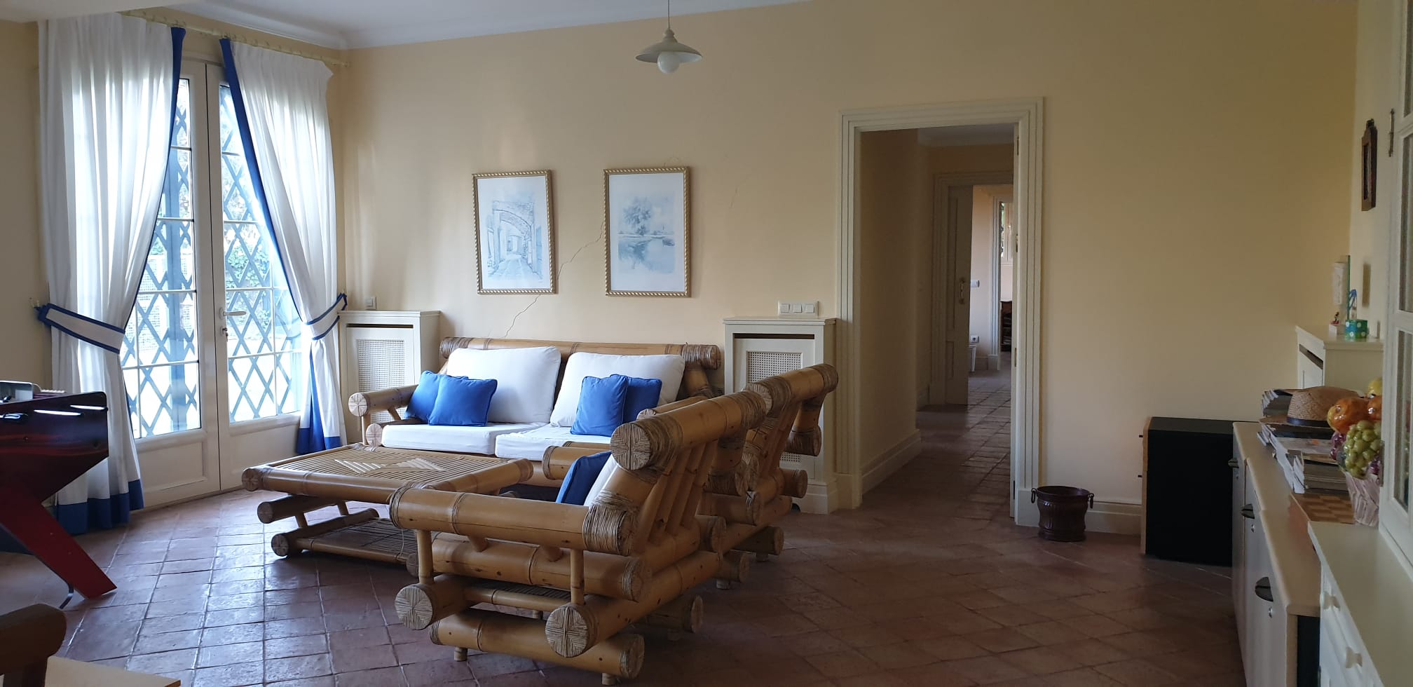 También una agradable habitación actualmente espacio de trabajo con acceso en el lateral a la parte del jardín con fuentes de un marcado estilo andaluz creando un ambiente de sosiego. Desde esta planta se accede directamente a la piscina de agua salada, ideal para nadar por su profundidad.